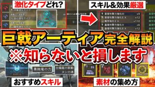 ▼アーティア武器解説▼アプデ4弾まとめ0:00 動画の概要基本システム0:36 ①巨戟アーティア武器とは?1:45 ②激化タイプ4:40 ③スキル6:04 ④巨戟復元強化9:03 ⑤便利な機能厳選9:51 スキル厳選の仕組み14:22 スキ...